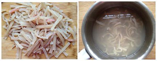 3、煮过的肉皮捞出,仔细削干净里面的肥肉,并将毛拔干净,清洗干净后切成细条。