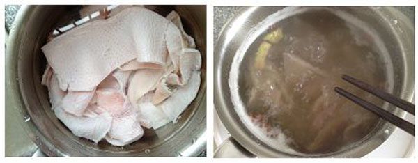 1、猪皮用水浸泡半小时,初步刮去多余的肥肉,再清洗干净。