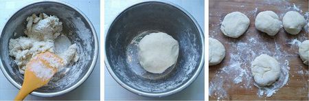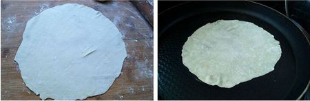 9、煎锅不放油烧热,放饼胚烙至一面略黄,表面气泡