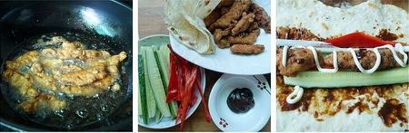 14、取一张饼,涂上适量甜面酱,放入两根黄瓜条,两根鸡肉条,一根甜椒,少许京葱丝,然后挤上沙拉酱卷起就可以食用了,怕卷不牢,可以用京葱丝绑一下哦