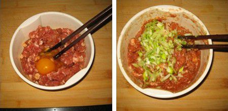 3、然后在肉馅中加入一个鸡蛋、糖、盐和适量花椒水,朝一个方向打馅(花椒水要分次加入肉馅中)直到肉馅有粘性;