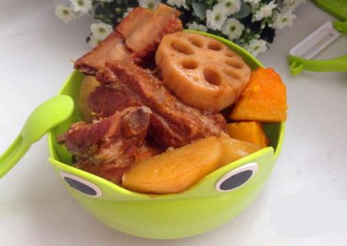 1.排骨清水泡半个小时,泡去血水,土豆削皮切块,莲藕削皮,南瓜切块。
