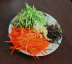 2、蒸的同时准备配菜。黄瓜和胡萝卜洗净,切成细丝待用,大蒜切成蒜末。