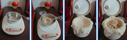 3、把蒸好的荞麦面包在屉布里面,用手沾水反复按压,整理成型。