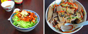 6、然后加入配菜和麻酱、酱油、醋等,充分拌匀即可开吃。