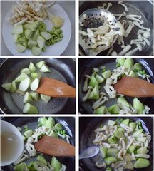 3、锅置火上适量油烧热,爆香姜片,倒入丝瓜中火翻炒。