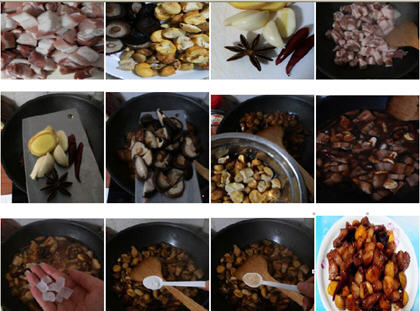 配料:栗子,香菇,姜、蒜切片,八角、干红辣椒