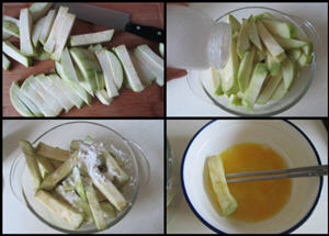 2. 在煎茄条之前拌入点干淀粉,方便裹蛋液,而且这样裹了蛋液的茄子能减少吸油。