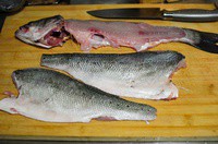 2、把海鲈鱼清理干净之后,片成两大片鱼排。