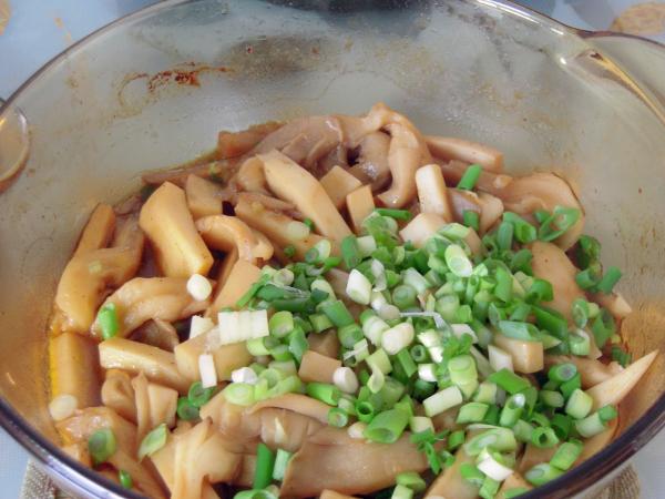 2、锅内适量的油,放入双菇煸炒,放入适量的五香粉、糖、生抽翻匀。