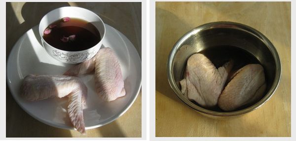 6、鸡翅用玫瑰蜜汁腌制12小时左右。