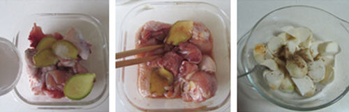 1、鸡腿肉切成小块提前入味。芋头也先加入盐等码入底味。因为我想让芋头蒸出来保持本色, 所以蒸时没有将它们拌在一起。