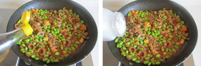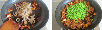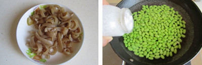 2、烧热锅,爆香剁碎的豆瓣酱翻炒,翻炒出红油后加入准备好的肉皮丝,再加入毛豆米一起翻炒,最后加入料酒和盐等调味料翻炒均匀即可。