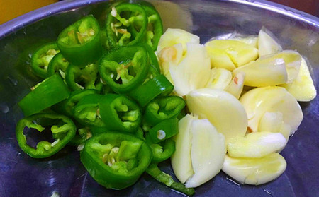 3、把蒜头、辣椒洗干净,蒜头剥皮切碎、辣椒切圈。