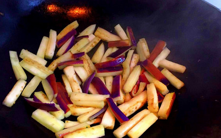 4、茄子捞起来放入油锅大火炒3分钟出锅。