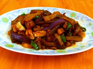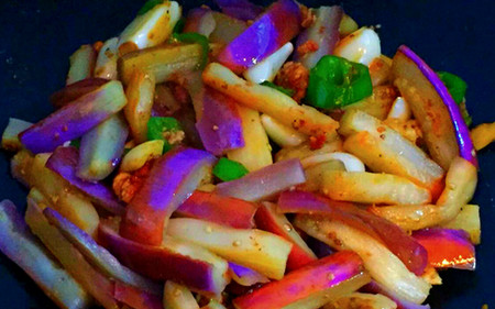 8、把炒过的茄子放入油锅里与瘦肉、辣椒、蒜翻炒4分钟、加入食用盐、酱油、鸡粉。