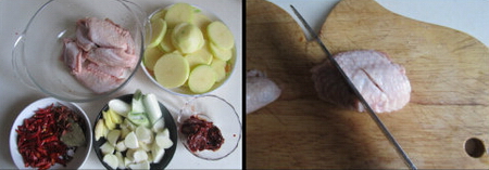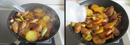 1.准备工作:在鸡翅表面划上几刀,加入盐、姜葱蒜和料酒腌制一下;下锅煎时无须加油,但要将表面的水分控干,下入锅中煎至两面金黄后捞出;你会发现锅中会剩余少许油,利用锅中的油来将土豆片也煎至两片金黄;