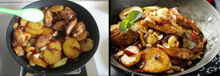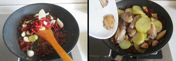 2.锅中放少许油,先将豆瓣酱炒出红油,下入葱姜蒜和大料爆香,再将提前煎好的鸡翅和土豆片翻炒,这时加入点料酒和酱油继续翻炒;翻炒后加入盐、糖等调味;最后出锅前加入熟花生米。