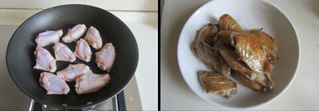 3.捞出鸡翅控干表面水分,无须放油,将鸡翅大块皮的部分朝下,平铺在锅中煎;