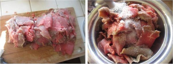 1.牛肉切2mm左右厚薄片,稍稍撒点盐,轻柔地抓匀。
