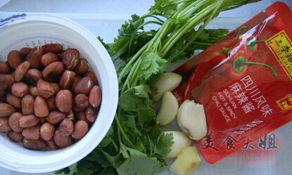 配料:蒜和姜,一匙五香辣椒油、2匙老醋,并撒上花生碎、芝麻、香菜。