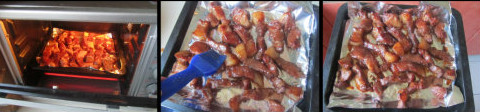2、烤叉烧肉时注意烤盘上要垫上锡箔纸,这样容易清洗烤盘。中间拿出来刷次腌制的料汁,最后一遍刷层蜂蜜。