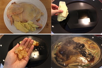 4.将鸡肉放入,盖锅,保持微沸煮20min(最后5min将鸡整个翻面)