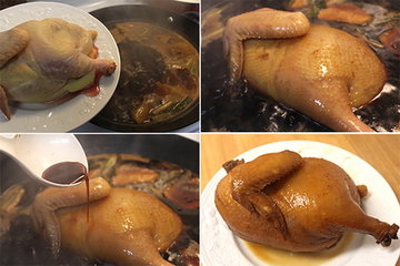 2.这个做法应该是最常用的,会比较费豉油(生抽、老抽、水、冰糖);如果不想浪费那么多豉油,可以减量,然后经常翻面尽量让鸡身各个面都能接触到豉油上色