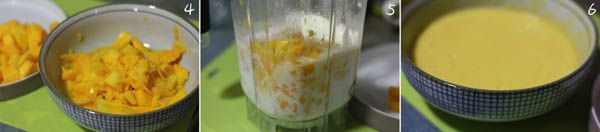 5、把芒果肉、椰浆和砂糖放在料理机里搅拌成均匀顺滑。