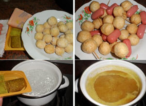 2.烧开水,倒入咖喱膏,搅拌至融化,再把咖喱汁煮浓稠一些。