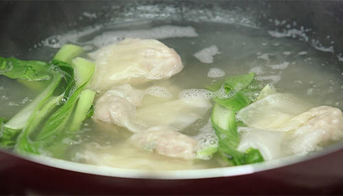 4、将熟的云吞下入热的史云生高汤,加少许盐跟白胡椒粉香油即可。
