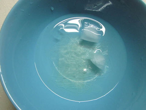2、把吉利丁片剪数段放在冰水泡软。