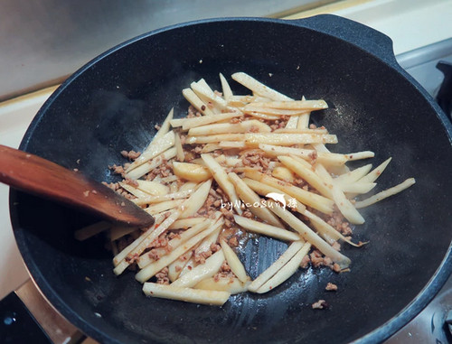 4、加一大匙水放马铃薯拌炒。