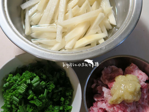 1、马铃薯切条,绞肉,蒜末,葱切细备用。