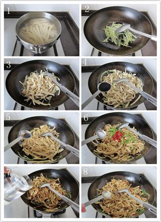 3、“辣”的程度是可以调节的:辣椒丝与葱姜一起、甚至先于葱姜丝煸炒,辣味最容易充分释放,菜品口感最辣。辣椒丝与豆腐皮一起入锅煸炒,次之。最后放辣椒丝,最不辣——适用于一切放辣椒的菜品。