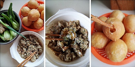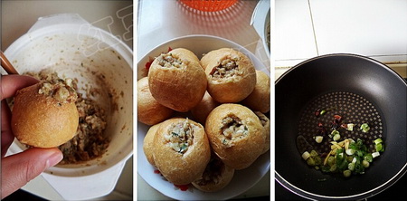 4、然后把拌好的肉馅用筷子一点点塞入面筋中。
