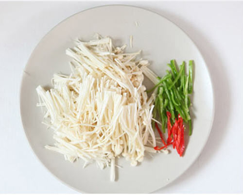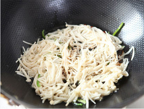 5、倒入金针菇、青红椒丝,翻炒上色。