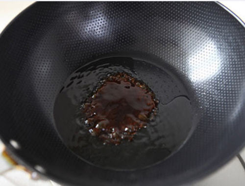 4、锅热入油烧至7成热,调入蚝油、糖炒散。