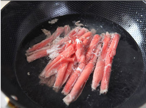 2、清水烧开,加入姜片、葱段和料酒,将肥牛焯水后捞出沥干。