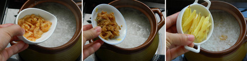 3、保持沸腾状态煮十分钟左右,这时米粒已经有爆开的迹象,加入海米、冬菜略煮,让粥有底味。