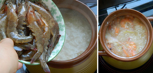 2、砂锅粥的主料是没有限制的,各种肉类、海鲜、禽类,都是可以的。砂锅粥加主料时建议不要那么的‘混搭’,最常见的是一粥一味,最多两味,多了就‘凌乱’了。今天这锅我只加了鲜虾,把虾剪开是为了虾的鲜味能加融入到粥里,而且吃时也方便,不用手剥。还特地加了我老妈自晒的海米,结果真的很提味。