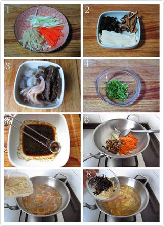 3、鱿鱼切丝,海参切粗丝或整个,虾仁切段或整个。