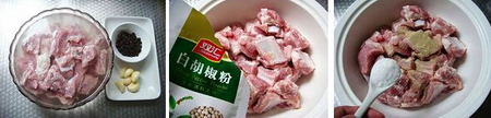 1、排骨剁小块,泡入清水中大约1小时,用手不断揉捏排骨洗净血水,洗净后的排骨沥干水分,姜、蒜切末。