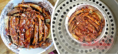 11.切好后和芋头间隔摆入碗中。(好不容易找到一碗,看看有点裂纹,只好用锡纸铺下。)