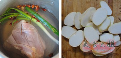 3.锅中入水加入猪肉、八角、葱,大火烧开,小火慢炖30分钟。