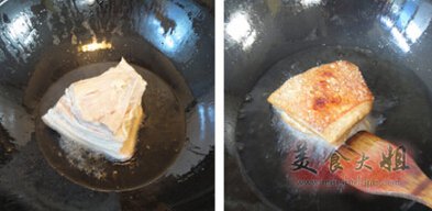 5.锅中入油,放入猪肉,皮的一面面朝下炸。