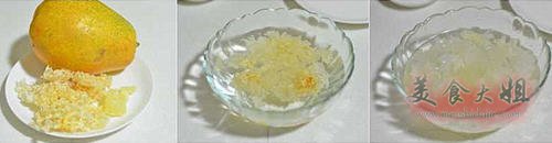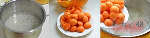 6、将挖好的木瓜球倒入煮好的银耳羹里。