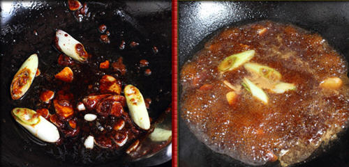 4、锅内油倒出一些,转中火,然后放黄豆酱煸香,约十秒钟。
