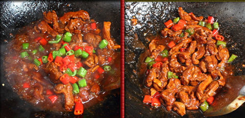 8、这里汤汁也快收干了,然后将青红椒放进去大火最后收汁就成了。