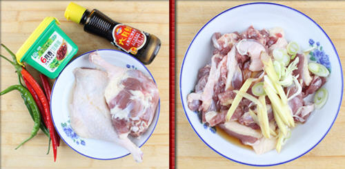 1、鸭腿去骨,剁成粗一些的大条,用黄酒,葱姜腌半小时